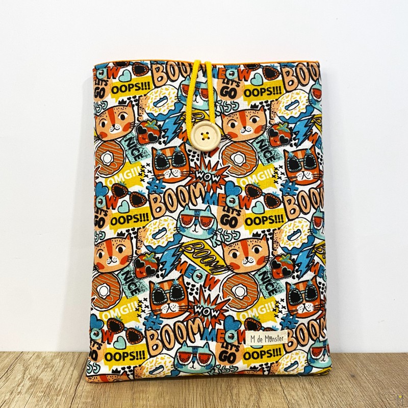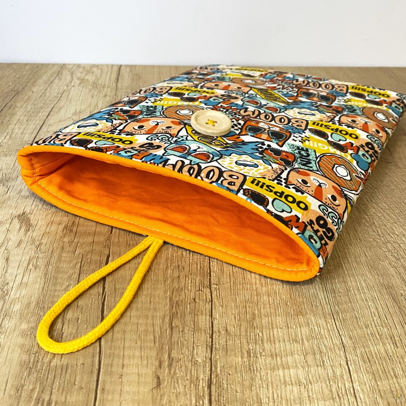Funda para libro tipo sobre, acolchada, de algodón y forrada. Cierre con botón de madera.